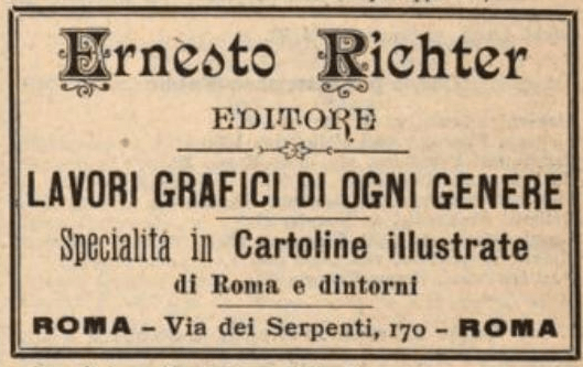 Ernesto Richter was a Roman publisher set in Via dei Serpenti 170. He was specialised in images of Rome, works of art in Roman museums, views of the Roman monuments and Roman suburbium. These images were taken by various photographers and published as postcards.