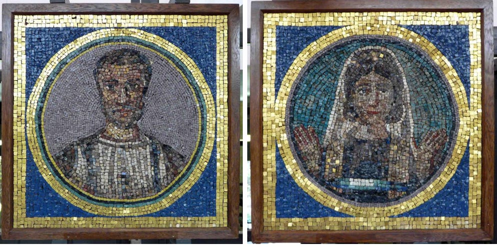 Following a ‘translation of saints’ bones’ in 1656 the mosaic portraits of Flavio Giulio Giuliano and Simplicia Rustica were discovered in the cemetery of Ciriaca, detached between 1656 and 1677 from a tomb with their epigraph and acquired by the collection of Agostino Chigi. They were placed, as was the custom at the time, on the wall in the staircase leading to the Library, according to a design by Pietro da Cortona Chigi and in a pattern not unlike the one we have mentioned for the Massimo collection. An interesting contiguity, therefore, between mosaics and libraries. It was not until 1918 that the mosaics were detached and acquired by the Lateran Christian Museum, where they were again restored.