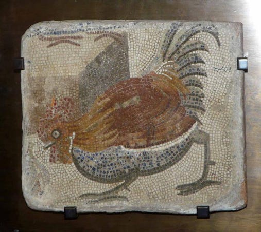 For our theme, an emblematic case is the brick with the mosaic image of a cock, a pavement emblem probably reused to close a niche. It was discovered in 1837 during the works of Virginio Vespignani in the cemetery of Verano, as stated in the sixth volume of Louis Perret’s disputed Catacombes of 1852, which places the mosaic to cover an unspecified martyr’s grave. Upon its discovery, it was sent straight into the Lateran Museum, where it was slightly restored and placed on the wall, in the large gallery of sarcophagi, along with all the other ‘sculptural works’, as noted in the catalogues of the time.