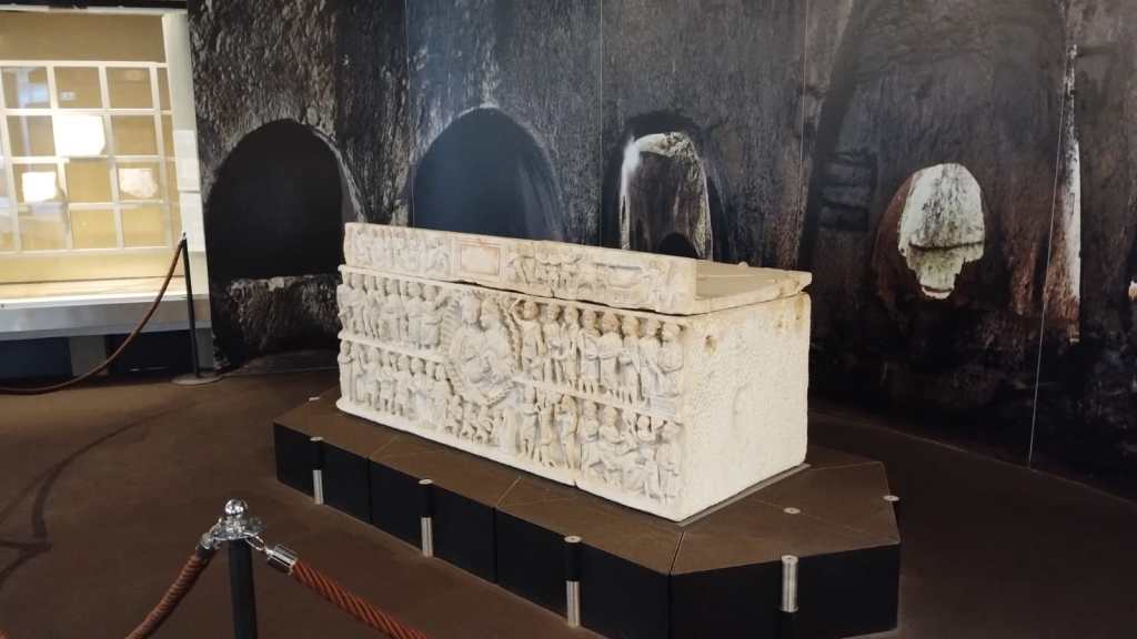 The entire F section on the first floor is dedicated to early Christian artifacts from the Syracuse area. It begins with an installation of the Adelfia rotunda from the catacombs of San Giovanni, with the sarcophagus of the same name at its center. The section mainly displays the most important Christian epigraphs of the sites and oil lamps found in the catacombs of San Giovanni, Vigna Cassia, Santa Lucia, and Cappuccini in Syracuse. The discovery of the Adelfia sarcophagus was undoubtedly one of the decisive moments in the creation of a museum in Syracuse.